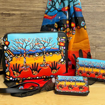 在 M2 画廊的原住民艺术礼品系列中,艺术家 John Rombough 的《Remember(守望)》格外动人:两位祖先伫立大地之上,双手高举,仿佛把祷词献给天空;色彩以鲜明饱和的红、橙、蓝为主,辅以粗黑线条,既强烈又均衡。画面构图对称——中央为“祖先”的守护之姿,下方的手掌与树木与之上下呼应,像天地之间的桥梁,指向“天地—祖先—人类”的内在连结。作品虽然没有文字,却仿佛从画面深处涌出无声的祈愿:愿每个孩子都被看见、被守护、被温柔以待。